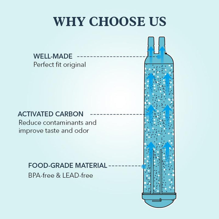 BPA-Free and food-grade materials, Sri Lankan coconut shell carbon block, super adsorption capacity, maximum reduction of harmful impurities contained in drinking water. Compatible with the following models: EDR3RXD1, 4396841, 9083, Filter 3, 4396710, 46-9020, 46-9030, T1RFKB2, T2RFWG2.