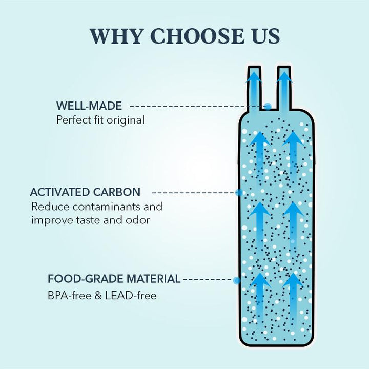BPA-Free and food-grade materials, Sri Lankan coconut shell carbon block, super adsorption capacity, maximum reduction of harmful impurities contained in drinking water,