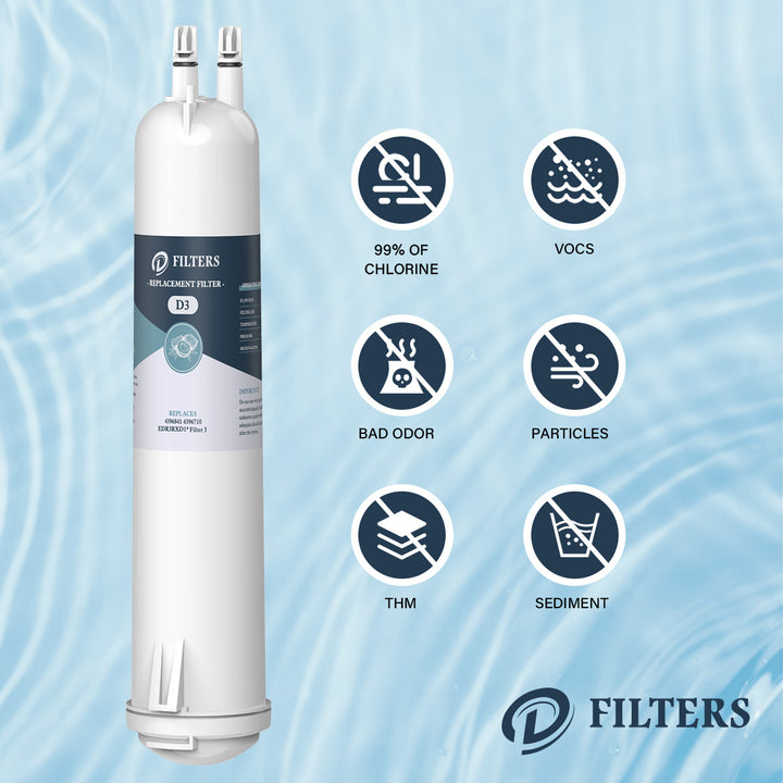 This(D3) refrigerator water filter 1 could reduce 24 impurities in water as well as other harmful contaminants. The fridge filter is compatible with Everydrop Water Filter 3, 4396841, 4396710 EDR3RXD1 Water Filter and 9083 Water Filter. We recommend to replace the filter every 6 months to ensure the filtration performance.